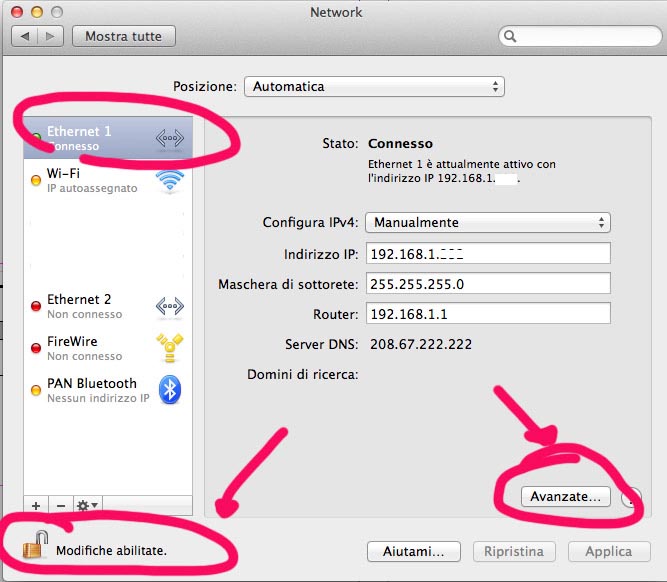 altrimenti sbloccarlo. Scegliere a sinistra la Scheda Ethernet con la quale ci si collega a internet e cliccare sul pulsante in basso Avanzate. Nella schermata che si apre scegliere la Scheda DNS, e inserire i valori del DNS Open DNS: |
